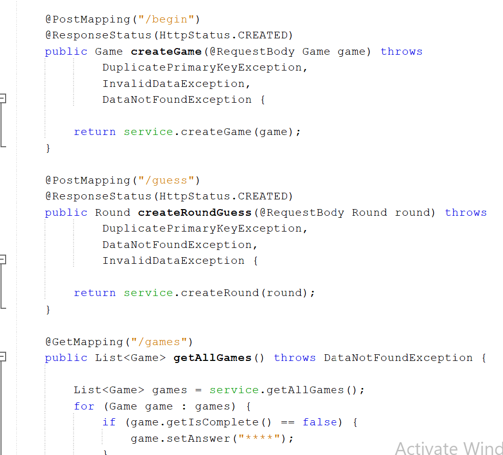 RESTful API in Java for a number guessing game. User submits a guess of four numbers and the application uses exception handlers and response entities to return appropriate error messages, HTTP status codes, and success responses to valid guesses.