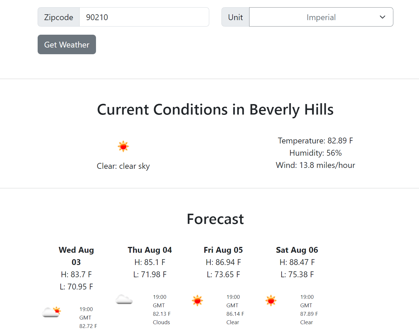 Client-side rendered web page using OpenWeather API and AJAX to obtain and display weather information for a user input zip code.